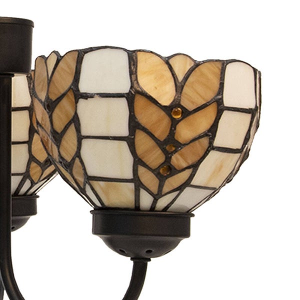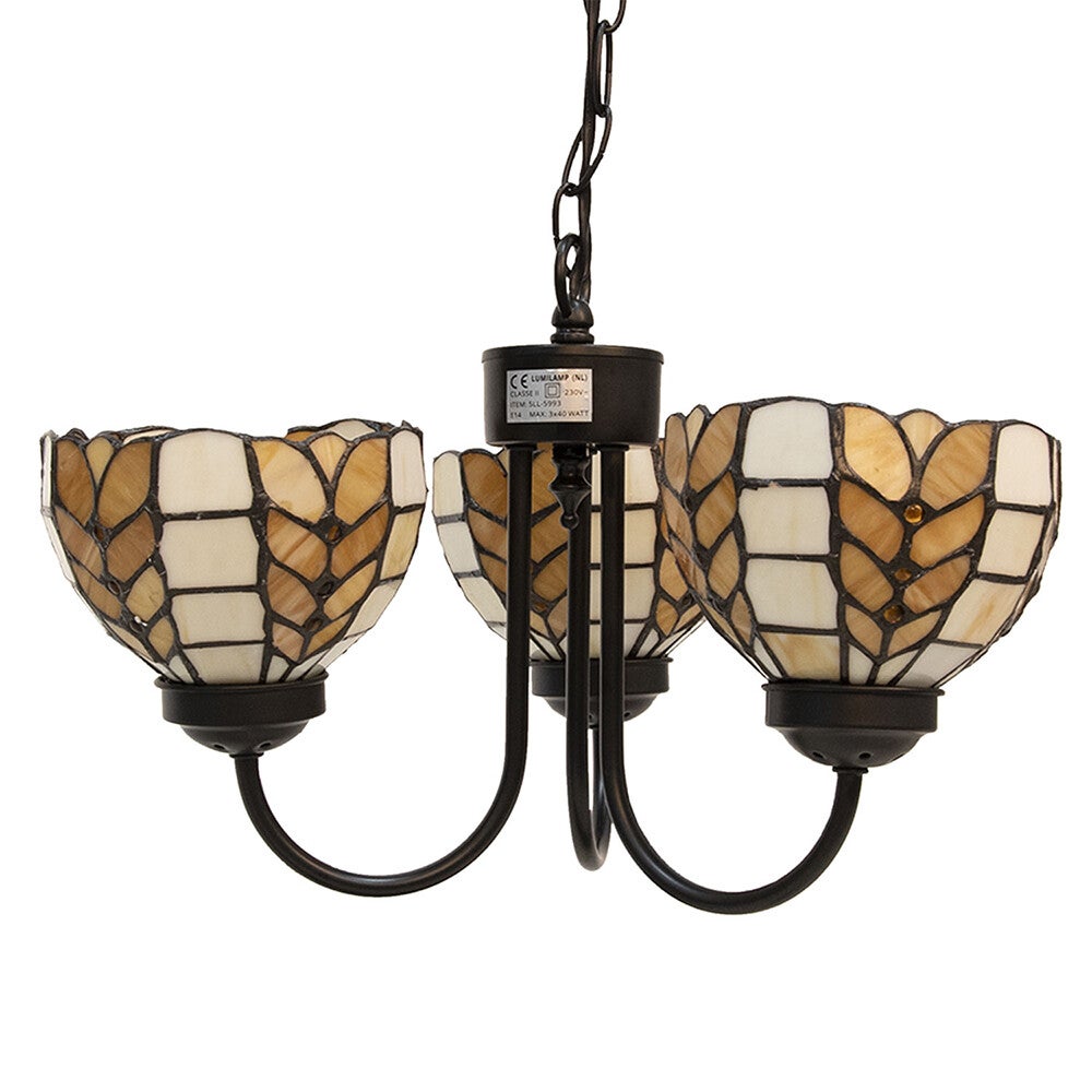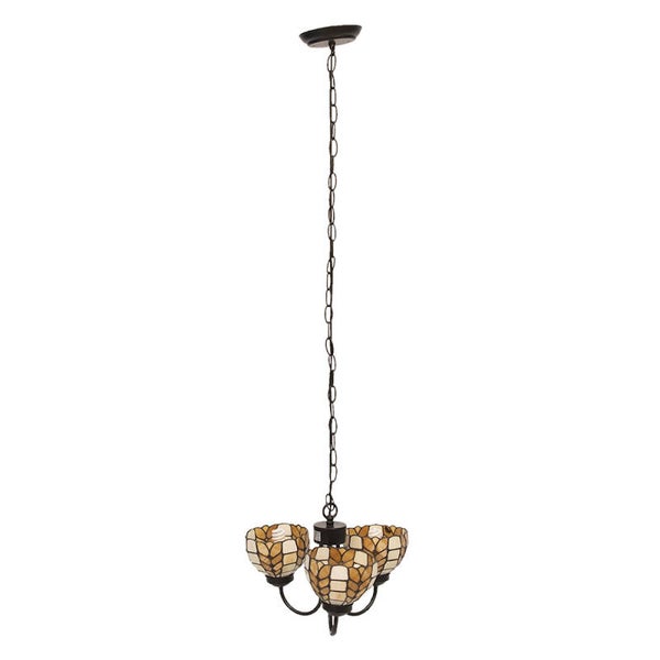 Klassieke Tiffany stijl glas in lood hanglamp met 3 lichtpunten in beige met een strak Art Deco motief.